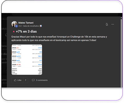 El promedio mensual de mis resultados está entre un 5% y un 8%. Dependiendo del tamaño de tu cuenta, estos porcentajes pueden equivaler a: - $500 - $900 - $5.000 - $9.000 y así sucesivamente.