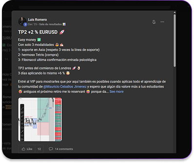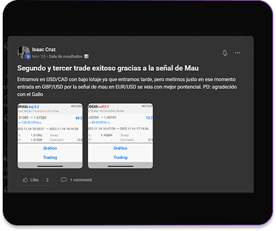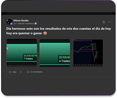 Únete a mi sala de trading donde comparto en tiempo real todos mis trades, para que tu simplemente los repliques en tiempo real y ganes dinero cuando yo lo hago