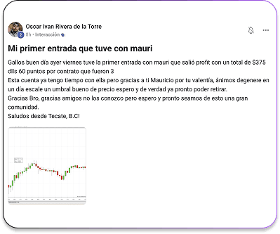 Mauri opera futuros, enfocado principalmente en el Nasdaq 100. Es un mercado con mucha liquidez y movimiento, ideal para una operativa clara, rápida y con reglas bien definidas.