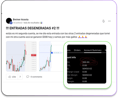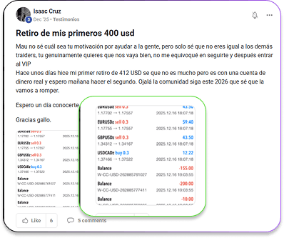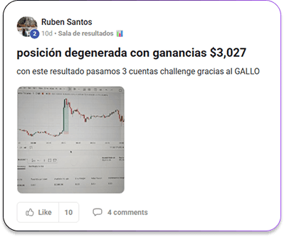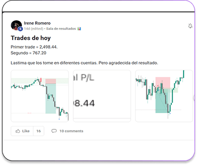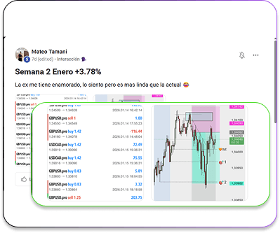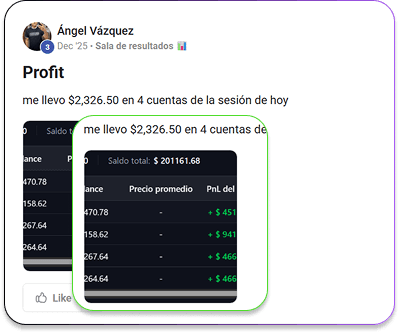 La operativa apunta a rendimientos consistentes, no promesas irreales. El promedio mensual suele estar entre un 5% y un 9%, y el resultado final depende del tamaño de la cuenta que estés operando. Ejemplo orientativo: Cuentas pequeñas → cientos de dólares Cuentas medianas → miles de dólares Cuentas grandes → cifras mayores, manteniendo el mismo sistema